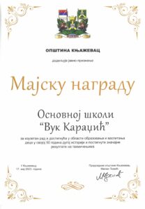 ОШ ,,Вук Караџић“ је добитник Повеље ,,Доситеј Обрадовић“ за 2023. годину за учешће установе у програмима и пројектима са значајним резултатима, за квалитет наставе, учења и васпитног рада, за примере добре праксе и успешну међународну сарадњу наставника и ученика. Повељу додељује коју додељује Министарство просвете Републике Србије.